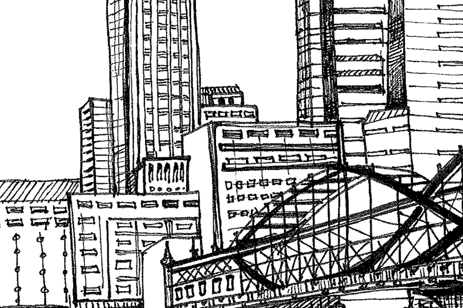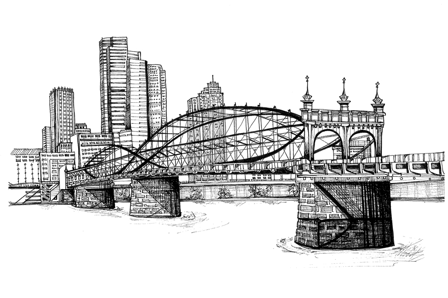 An 8.5x11" digital print will be sent to you in an archival sleeve. Shipping flat, in a stiff mailer for protection. It is an originally hand drawn illustration of the Smithfield St Bridge, otherwise nicknamed the "Kissing Fish Bridge" which I love... who knew, Pittsburgh is for lovers!