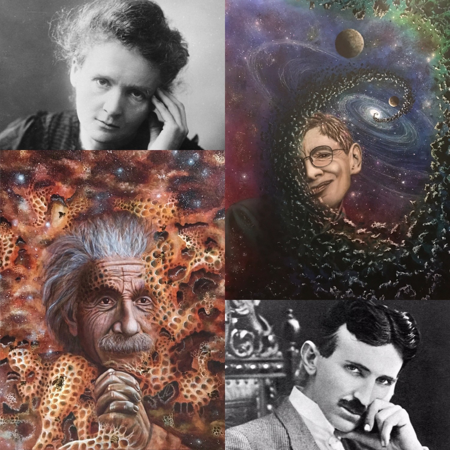 Giclee on canvas print, #1 of 4 in the "Scientific Saints" series by Katy McManus, featuring Albert Einstein, Stephen Hawking, Nikola Tesla, & Marie Curie.