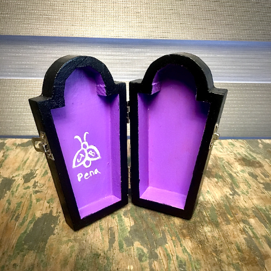 Hand-painted box finished with protective varnish. Can be used indoors or outdoors. Can be used as a small storage compartment of as decoration. Perfect for year-long Halloween lovers!